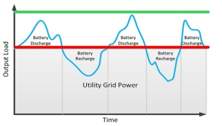 假定我們?cè)?000KVA變壓器和配電系統(tǒng)后帶一套2500KW的UPS系統(tǒng),設(shè)計(jì)帶平均值為2000KW的IT負(fù)荷。當(dāng)IT負(fù)荷處于波峰時(shí)段達(dá)到2400KW時(shí),UPS會(huì)同時(shí)利用從電網(wǎng)吸入的2000KW功率+電池組提供的400KW功率,通過(guò)逆變器給2400KW的IT負(fù)荷供電。利用鋰電池儲(chǔ)存的能量短時(shí)間內(nèi)應(yīng)對(duì)IT峰值,同時(shí)又不讓變壓器和配電系統(tǒng)過(guò)載。