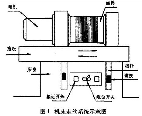 高速線切割機走絲機構(gòu)是影響其加工質(zhì)量和加工穩(wěn)定性的關(guān)鍵部件。送絲機構(gòu)的作用是驅(qū)動電極絲以一定的線速度前后移動,將電極絲整齊地排列在儲線筒上。儲線筒本身的高速正反轉(zhuǎn)是通過電機的正反轉(zhuǎn)來實現(xiàn)的。電機通過聯(lián)軸器帶動螺桿筒,再通過同步帶帶動螺桿轉(zhuǎn)動,使滑架往復(fù)運動,通過調(diào)節(jié)換向左右保險杠之間的距離,即可實現(xiàn)滑架的移動行程。機床的送絲機構(gòu)如下所示。
