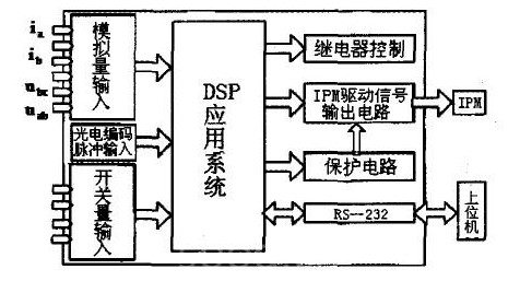 采用數(shù)字信號處理器作為控制器,可以減少外圍設(shè)備的數(shù)量,提高系統(tǒng)的穩(wěn)定性。在本設(shè)計中,主要使用了1MS32OC24Ox DSP的PWM輸出端口、板載A/D端口和捕獲接口CAP。DSP的六路PWM信號經(jīng)緩沖器反相后送到驅(qū)動電路板驅(qū)動IPM??刂葡到y(tǒng)結(jié)構(gòu)圖下所示。