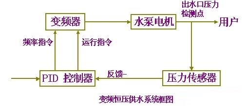 設(shè)備實時通過傳感器檢測出口壓力,將檢測值和設(shè)定值進行比較運算,確定電機及水泵投入臺套數(shù)和變頻器輸出頻率(反應(yīng)到電機及水泵為轉(zhuǎn)速)以追貼用水曲線實現(xiàn)恒壓。